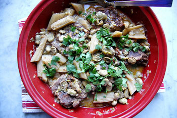 This tagine is made with lamb neck -- a very flavorful and easy to cook cut of lamb that is similar to lamb shanks. It is common here and in some parts of France, but I'm guessing hard to get in other places. Fell free to substitute shanks, or you can also use beef stew meat. Cheers to spring everyone!