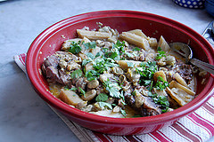 This tagine is made with lamb neck -- a very flavorful and easy to cook cut of lamb that is similar to lamb shanks. It is common here and in some parts of France, but I'm guessing hard to get in other places. Fell free to substitute shanks, or you can also use beef stew meat. Cheers to spring everyone!