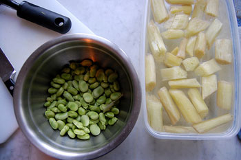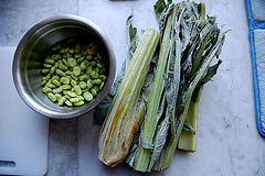 5. After an hour, add in the fava beans and cardoons (or artichokes). If the water looks low you can add more water, but you shouldn't need to. Season with a bit more salt and add a squeeze of the lemon juice and half of the chopped cilantro. Cover and cook for another 20 minutes.